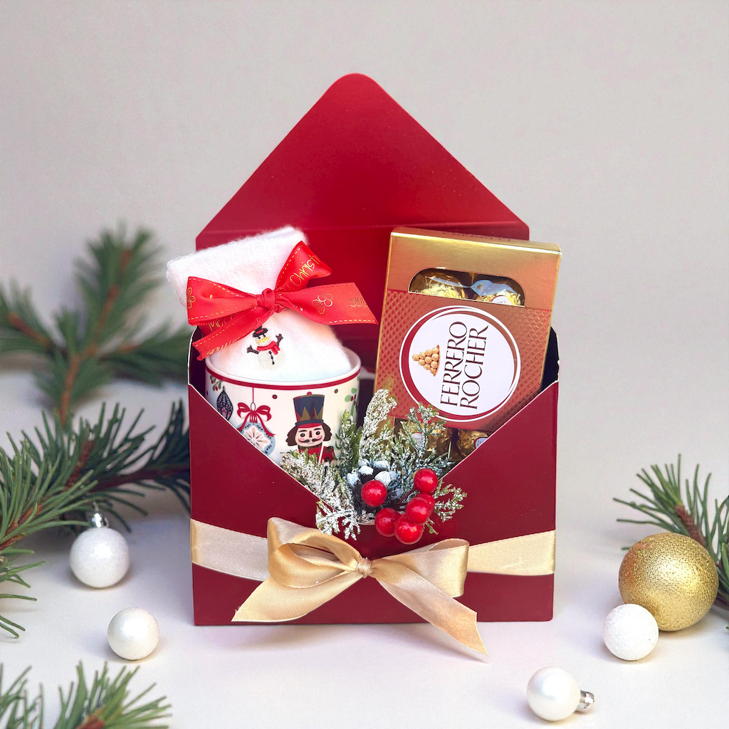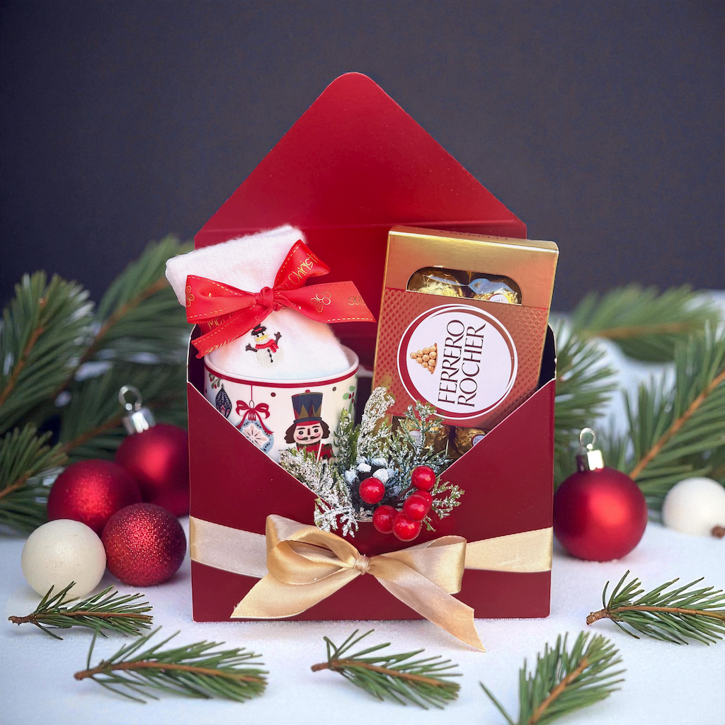 Коледен подарък плик „За Нея“ – Топлина в кутия с чорапки и сладост в шоколад! Перфектният коледен комплект за теб или любим човек. 🎁❤️