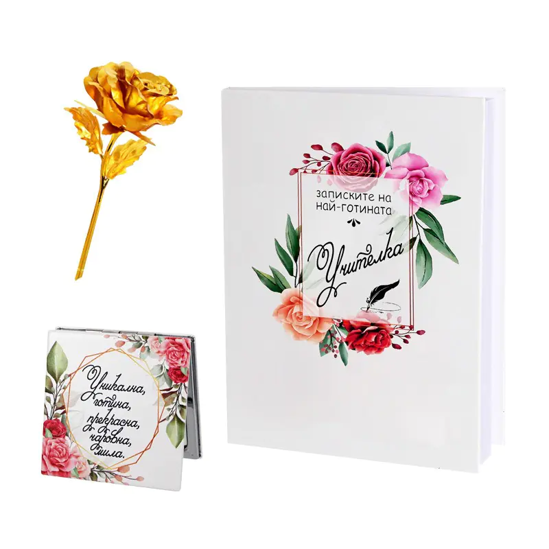 Подаръчен комплект „Учителка“ – златна роза, огледало и бележник в кутия.