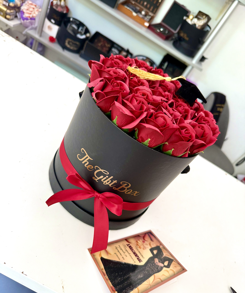 Подарък за абитуриентка, включващ рози и шапка.